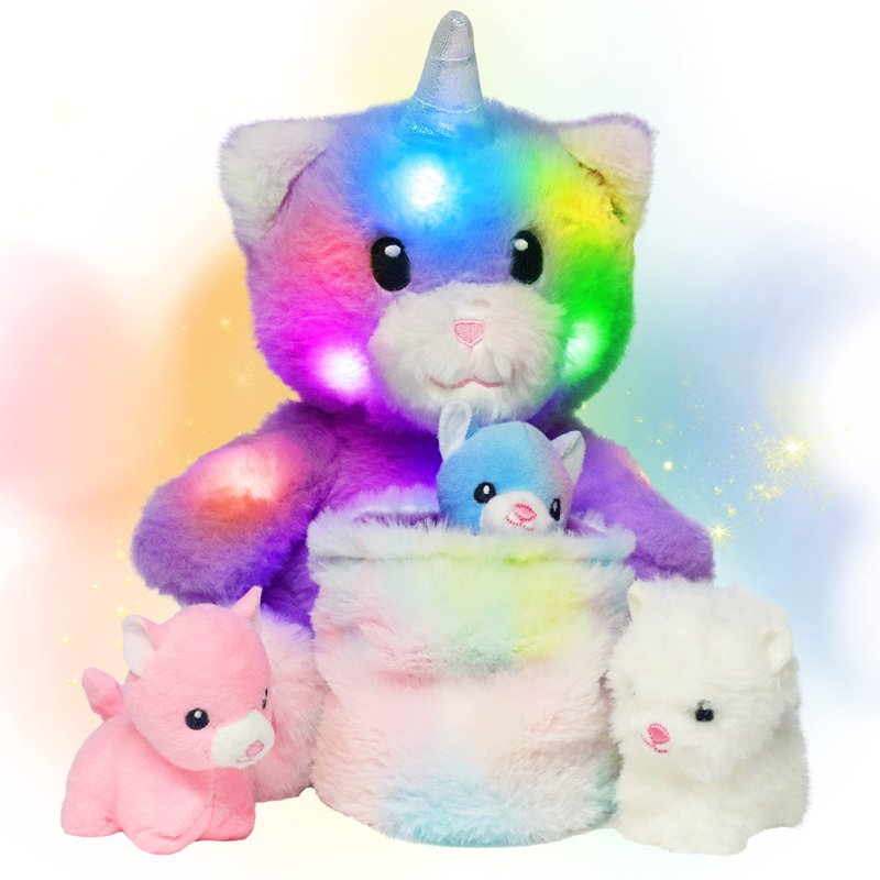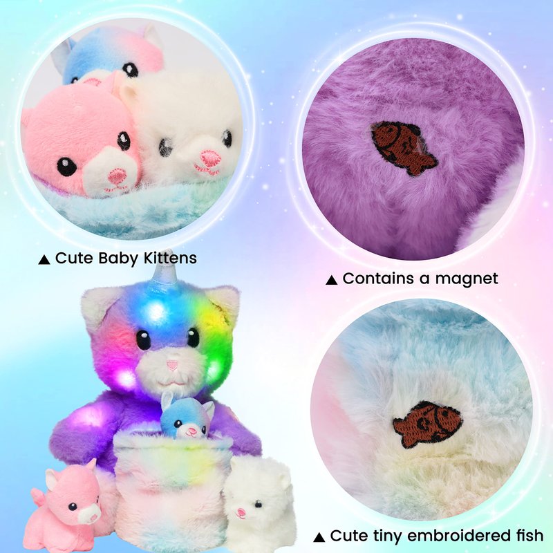- FOUR CATS IN ONE SET: The light up stuffed mommy cat comes with a surprise in her bucket, 3 baby kittens that can be taken out from it. And the bucket is magnetic, a tiny fish was embroidered on the cat's belly and the body of the bucket, under it is a magnet, through the magnets, you can remove them or close them together easily. The Mommy cat comes with purple plush, 3 baby kittens have different colors, they are rainbow pink, white, blue respectively.