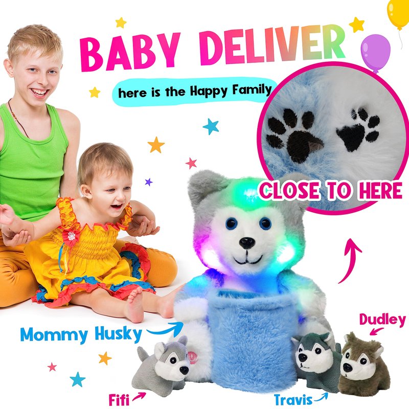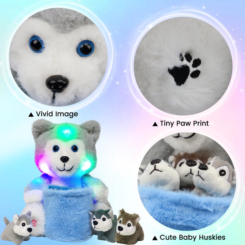 - FOUR HUSKIES IN ONE SET: The light up stuffed mommy husky comes with a surprise in her bucket, 3 baby puppies that can be taken out from it. And the bucket is magnetic, a tiny paw print was embroidered on the husky's belly and the body of the bucket, under it is a magnet, through the magnets, you can remove them or close them together easily. The Mommy husky comes with purple plush, 3 baby puppies have different colors, they are in different shades of gray.