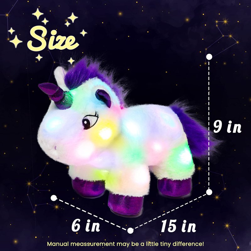 - COLORFUL CHANGING LIGHTS & AUTOMATIC TURN OFF: This plush unicorn features of glowing in the dark and the light will change multiple colors every few seconds. Additionally, we installed a 15 minute timer inside which will turn off automatically if you do not touch the on-off in 15 minutes. While, you can still turn it off as you like by pressing the switch again.