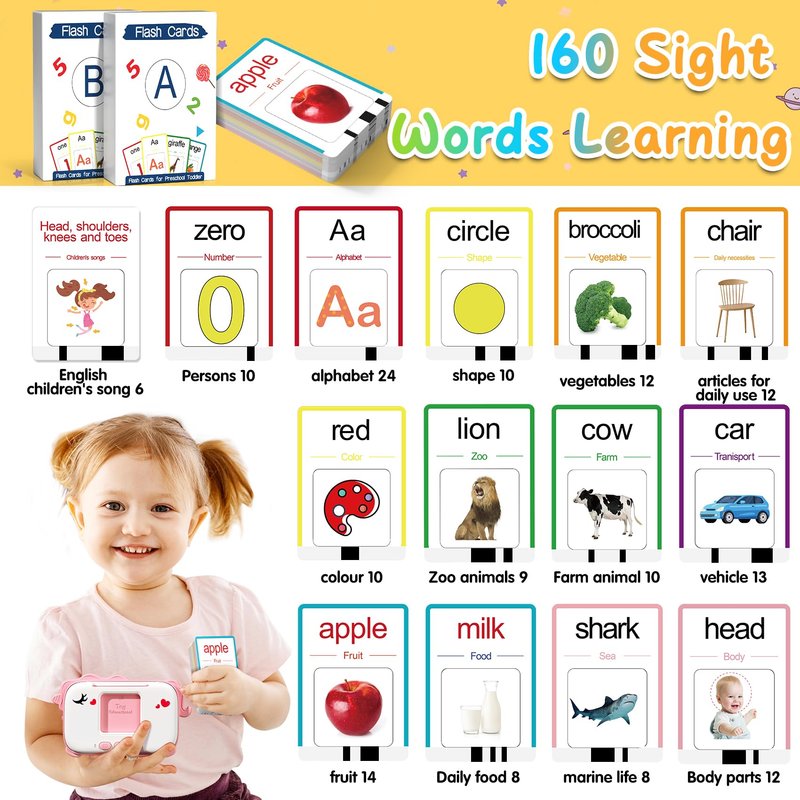 - [Toddler learning toys]: This Toddler learning toy includes a cute unicorn-shaped card reader with 160 visual words. Including fruits, food, marine animals, body parts, colors, animals, farms, transportation, daily necessities, vegetables, shapes, numbers, alphabet, nursery rhymes and other 14 themes. Enhance children's cognitive ability, exercise listening and establish vocabulary for children. Great sensory toys for autistic children.