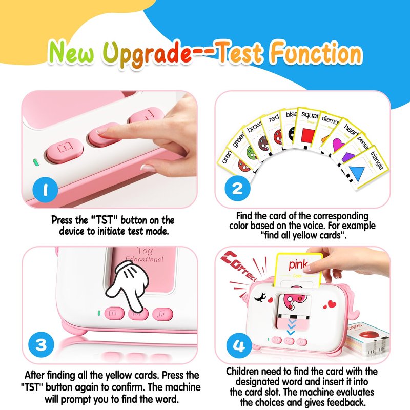 - [Test Mode]: Click "TST" to enter the test mode. After finding all the cards with corresponding colors according to the voice prompts, press the "TST" button again to confirm the selection. The machine will prompt you to find out what words. Children need to find the corresponding words and insert them into the card slot. Finally, the machine will evaluate the selection and give feedback. Correct answers will be praised, and wrong answers will encourage children to try again.