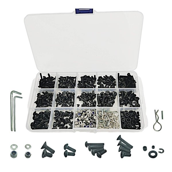 - 【Package Content】: M3 & M4 screws (flat head & round head), M3 & M4 nuts and gaskets, 2x10mm wheel hub nut pins, O ring, M2.5 E buckle and rc body clips, 522pcs totally