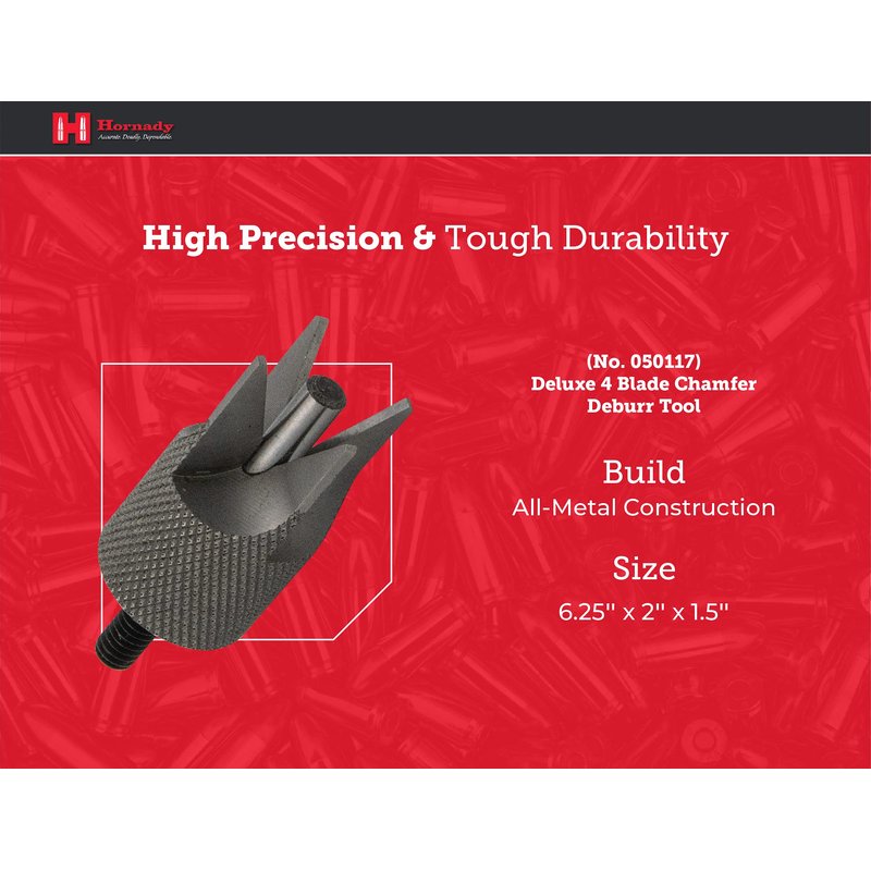 - Case Mouth Deburring Tool - keep your casings smooth and precise with this single piece Hornady Deluxe 4 Blade Deburring Tool 050173. This handheld tool has a knurled center section to provide a comfortable gripping surface