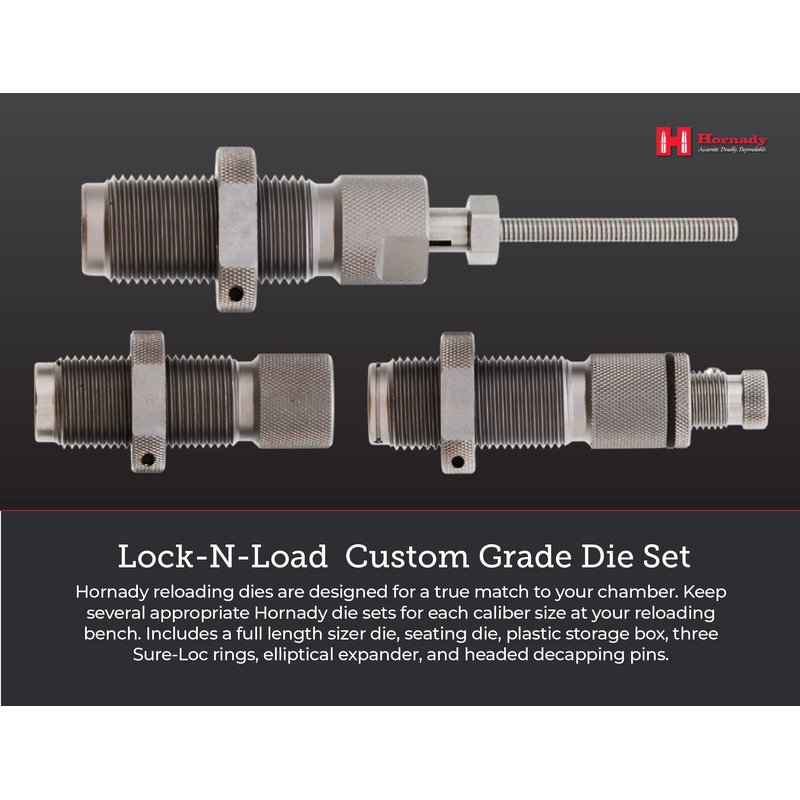 - Precise Machining for Accurate Reloading - Hornady reloading dies are designed for a true match to your chamber. Keep several appropriate Hornady die sets for each caliber size at your reloading bench. Includes a full length sizer die, seating die, plastic storage box, three Sure-Loc rings, elliptical expander, and headed decapping pins