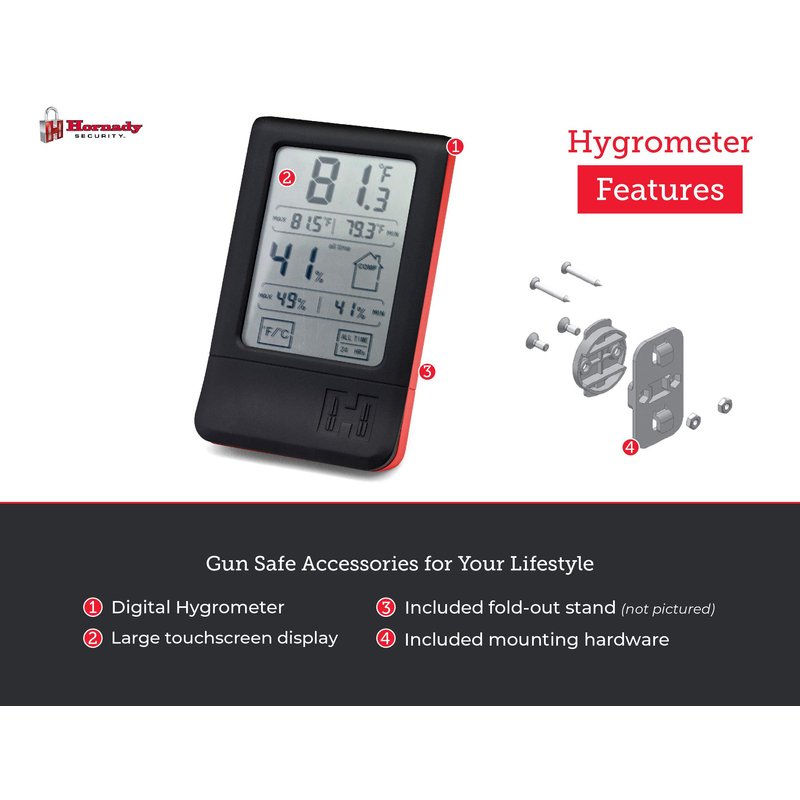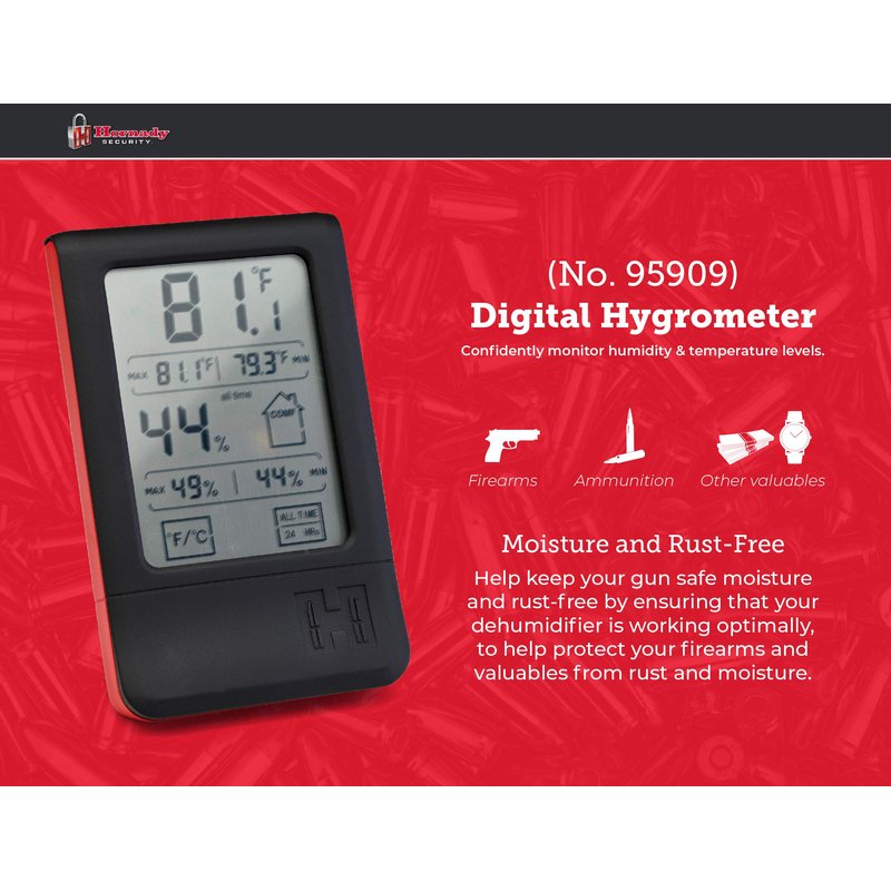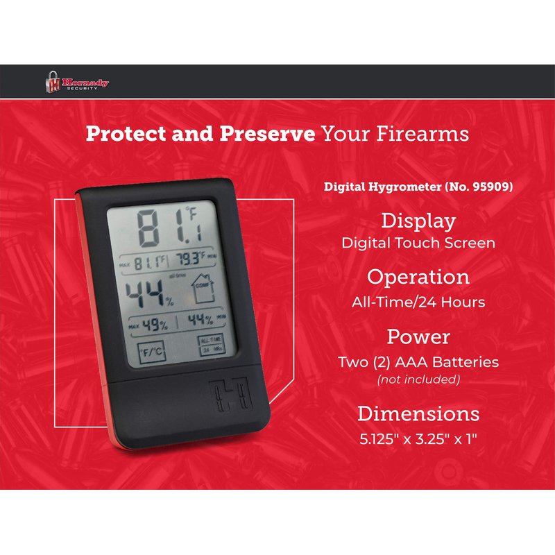 - Monitor Humidity & Temperature Levels - help keep your gun safe moisture and rust-free by adding this Hornady Digital Hygrometer (95909) to your gun safes & cabinets to ensure that your dehumidifier is working optimally to help protect your firearms, gun accessories, ammo and valuables from rust and moisture
