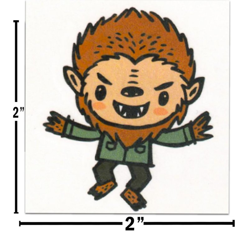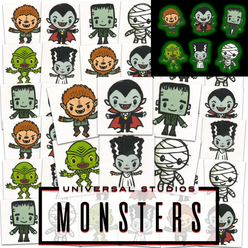 - Package of over 70 Universal Monsters temporary tattoos, perforated for convenience. Each tattoo measures 2" x 2" and glows in the dark.