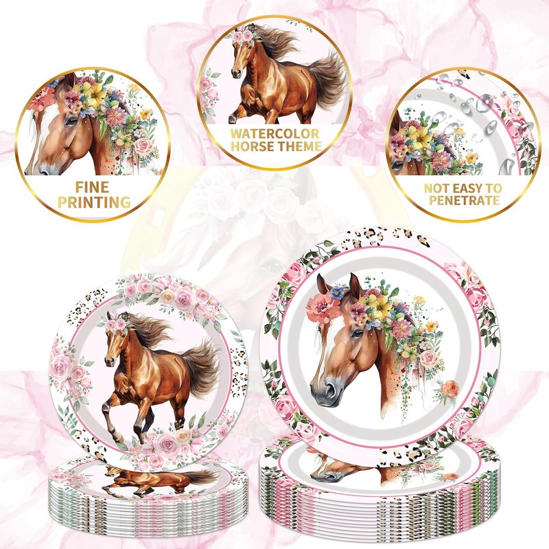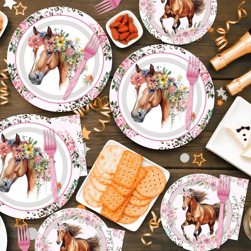 - 96Pcs Horse Party Tableware Set: Elevate your party experience! Our pink horse party tableware set creates a visual feast for 24 guests, featuring 24 each of 9-inch dinner plates, 7-inch dessert plates, napkins, and plastic forks.