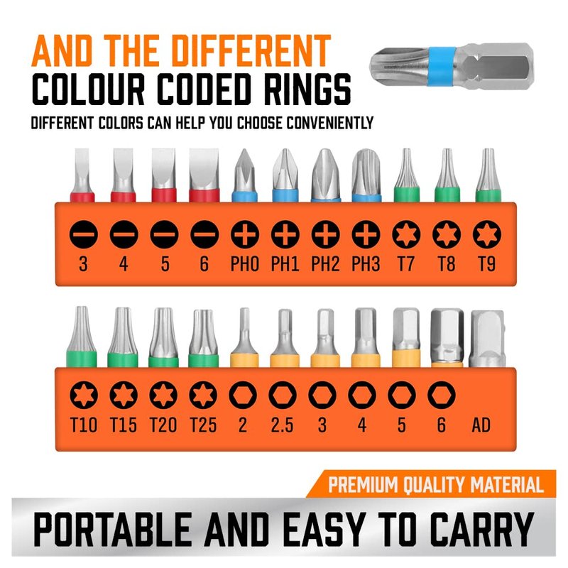 - 【S2 STEEL BITS HRC 60°】 4 Pieces-Phillips Bit (#0, #1, #2, #3); 4 Pieces-Slotted Bits (3mm, 4mm, 5mm and 6mm); 7 Pieces-Torx Star Bits (T7, T8, T9, T10, T15, T20, T25); 6 Pieces-Hex Bits (H2, H2.5, H3, H4, H5, H6); And 1Pc 6.35mm ADP.