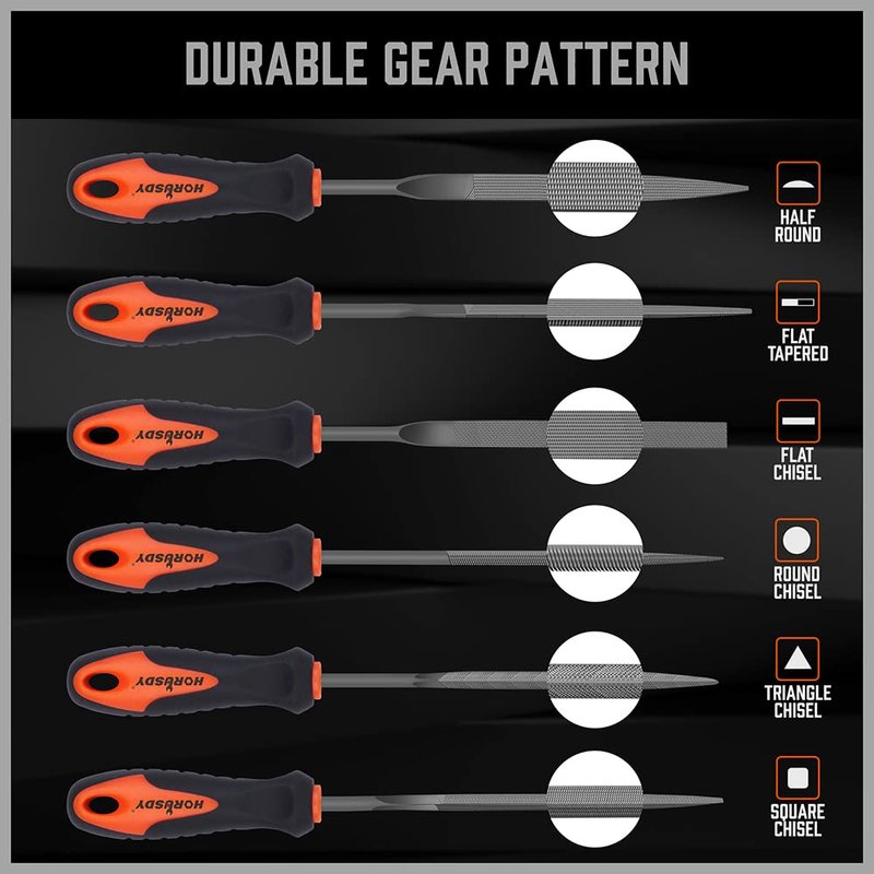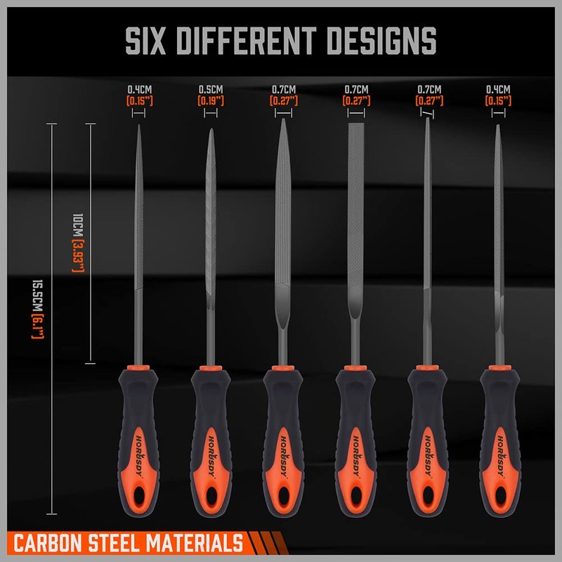 HORUSDY 6-Pieces Needle File Set, Hand Metal Files, Alloy Strength Steel Include Flat, Flat Warding, Square, Triangular, Round, and Half-Round File.