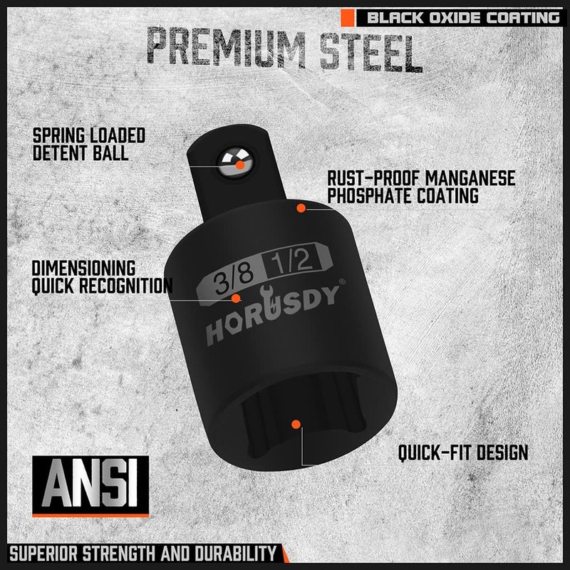 HIGH MATERIAL:This impact adapter reducer set is constructed of heavy duty drop forged and heat treated chrome vanadium steel, Black oxide coating with bracket torque compression have superior strength and durabilityto meet standard operating conditions.