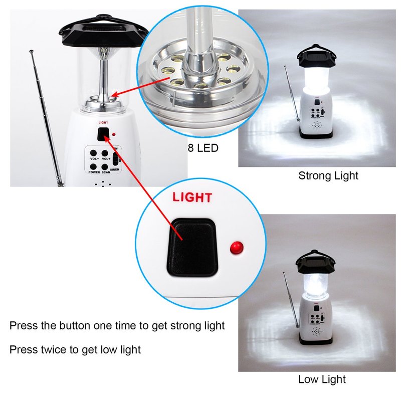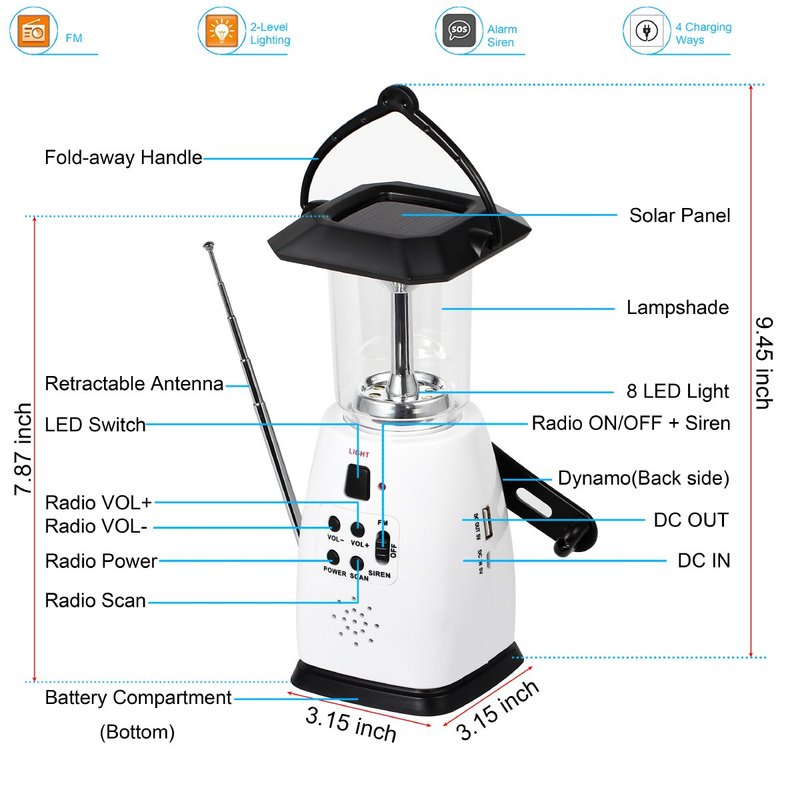 Seamlessly combining an LED lantern, a FM radio and a cell phone charger together, the HOSHINE Camping Lantern is not only an ideal companion for your outdoor activities such as camping, hiking, backpacking and etc, but also an invaluable and indispensable tool for your emergency preparedness needs thanks to its revolutionary design and engineering of multiple power options.