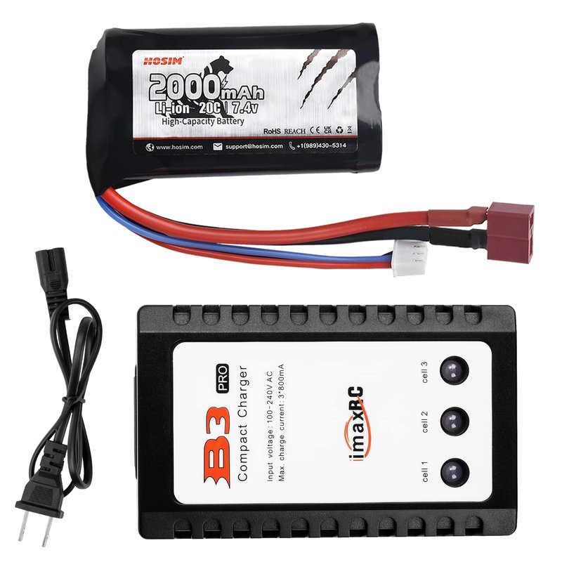 Hosim 1pcs 2S 7.4V 2000mAh 20C T Plug Female Connector Rechargeable Battery,1pcs Balance Charger Safe & Fast Charging for 9155 9156 Jumper T16 RC Cars Evader BX Truck UAV Drone FPV