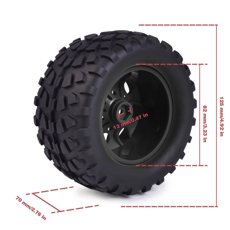 - Size:70*125 mm/2.76" * 4.92" . Package: 4 Tires+4 Sponge+4 hubs (NO glue included). Suit for 1:10 RC Crawler, which is 12mm Hex.