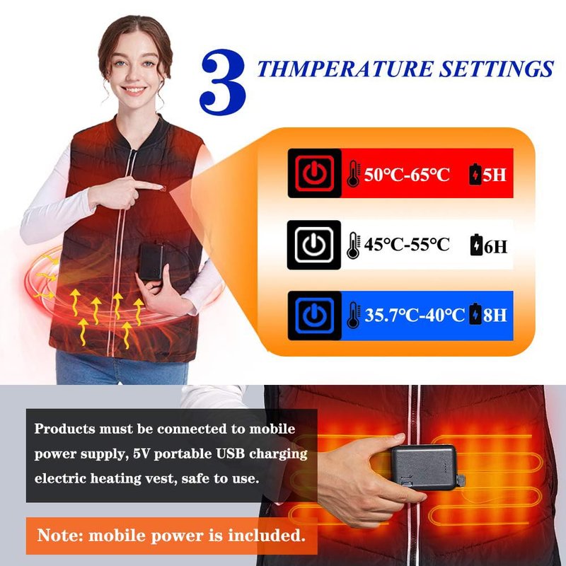 - [Comfort and Safety] Our heating vest has a protection module inside. No radiation, low voltage, once overheated, it will stop until it returns to standard heat. Heat can be freely chosen and adjusted to suit its own heat. High safety index, suitable for all. If you have any questions, please do not hesitate to contact us.