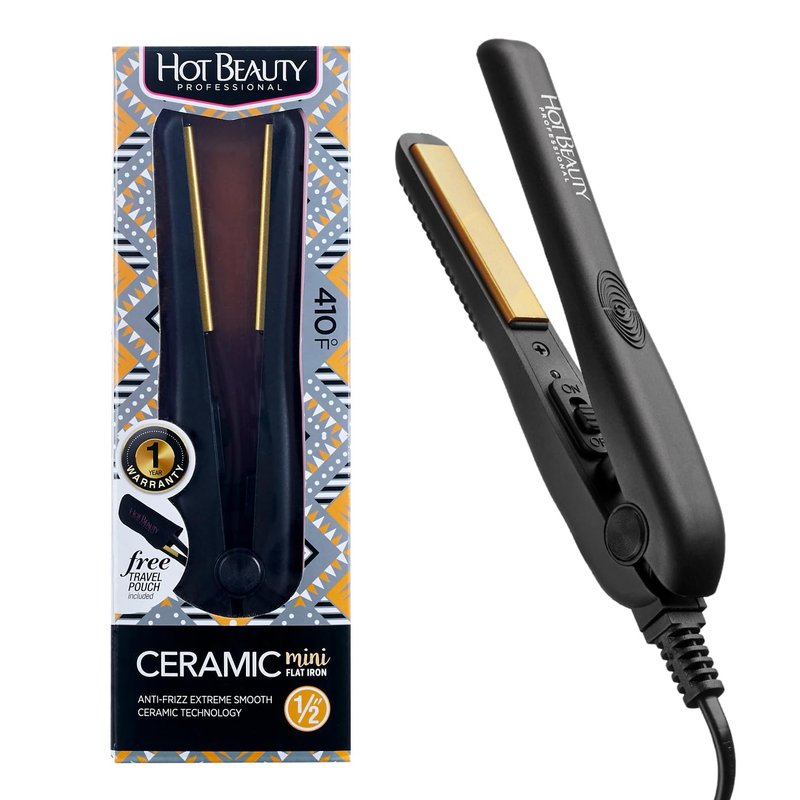 Hot Beauty Professional Ceramic Mini Flat Iron 1/2", Anti-Frizz, Fast Heating, Versatile Styling for Curly & Straight Hair, Ideal for Traveling with Travel Pouch (Black)