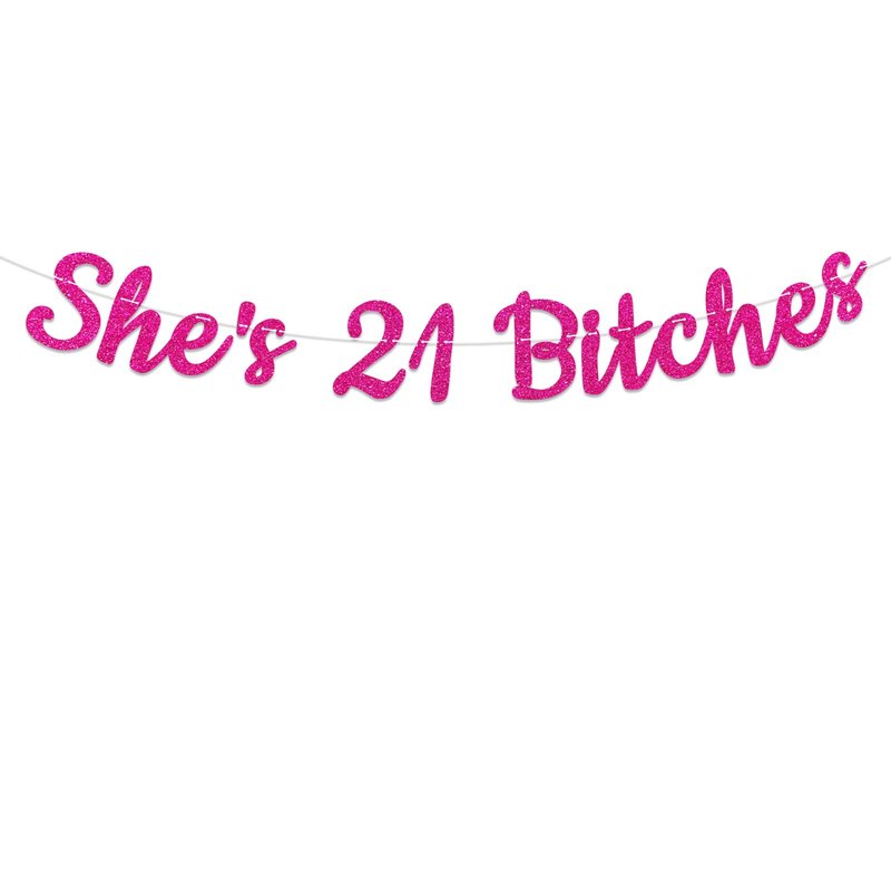 - PACKAGE: Hot pink glitter She's 21 Bitches banner with rope to hang