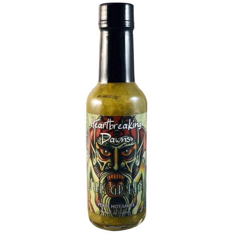 Heartbreaking Dawns The Green Verde Hot Sauce (5 fl. oz. / 148 ml.): Heartbreaking Dawns uses only the finest all-natural ingredients to bring you this bold and flavorful take on a classic Verde-style hot sauce. Fresh tomatillo, fragrant cilantro, and a kiss of ghost pepper (the worlds hottester pepper) to set the stage for indulging on all of your verde cravings. Ingredients: Tomatillos, Distilled Vinegar, Onions, Fire Roasted Jalapeno Peppers, Serrano Peppers, Garlic, Water, Lime Juice, Cilantro, Green Habanero Peppers, Jolokia Peppers, Salt