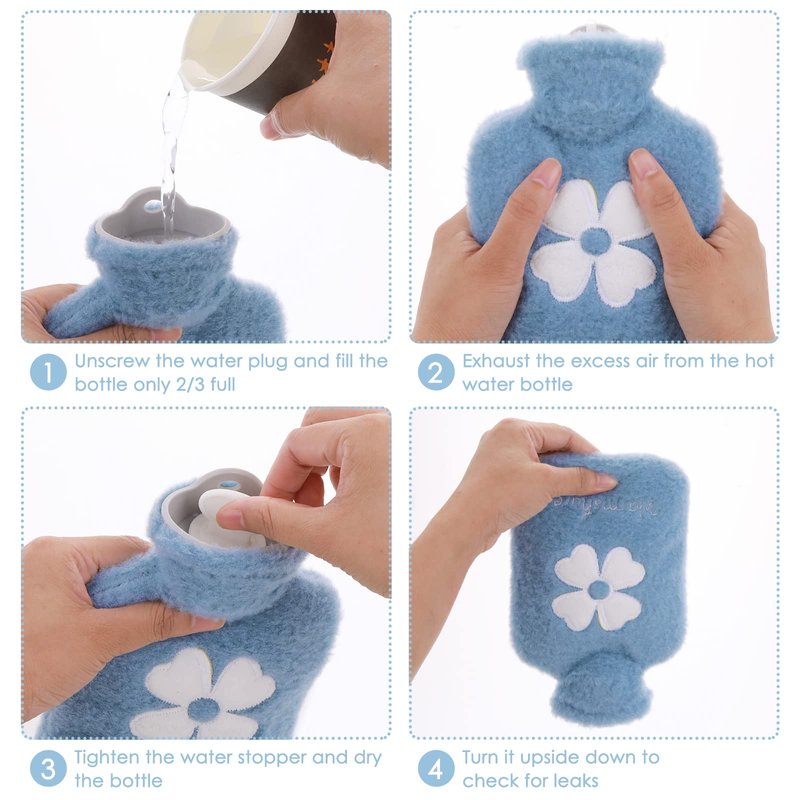- SIZE DETAILS: 13.5cm(5.3in) wide /21.5cm(8.5in) length,Hot water bottle fill only to 2/3 water capacity maximum . Hot water bottle with cover the cover is washable. Simply warm water to the small hot water bottle and tighten the stopper.WARNING: Never use boiling water for safety reasons.