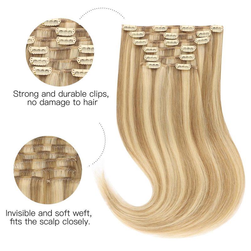 - Premium Real Human Hair Extensions -- Our clip in hair extensions are made from Remy Human Hair. Either the gloss or softness, it's no different from your natural hair. They blend perfectly with your hair color giving you the volume or length you're looking for. At the same time, it's very supple, as it combs and styles easily without tangling or melting. 100% restore the material and touch of real hair.