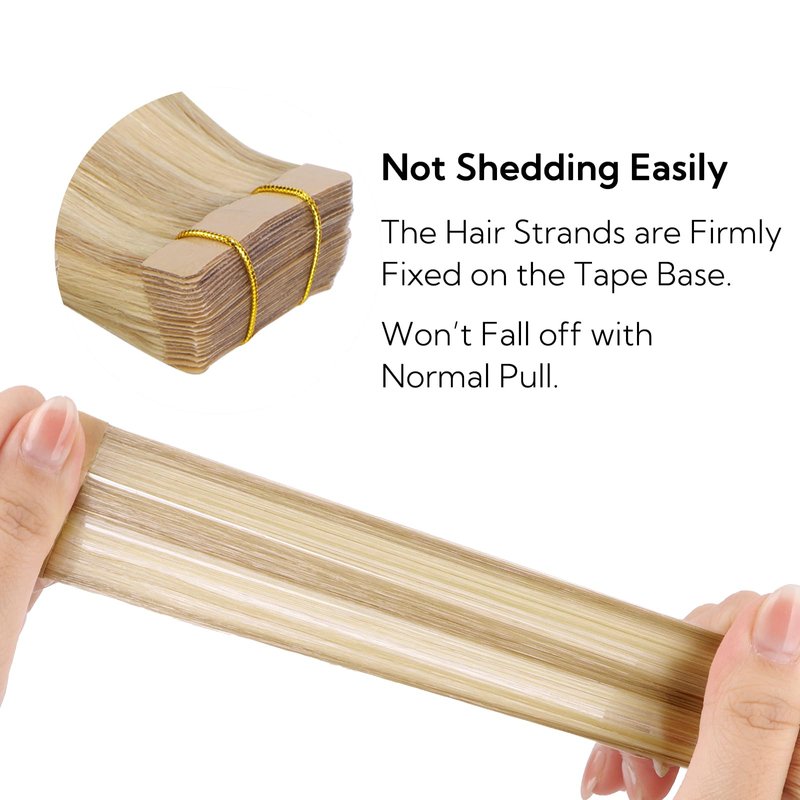 - 【Firm & Invisible Tape】Every strand of remy human hair extensions is firmly fixed with transparent tape. There is no worry that tape irritates your skin for the material is hypoallergenic so it won't damage your scalp and hair. Also the tape can be easily removed with remove oil without residue