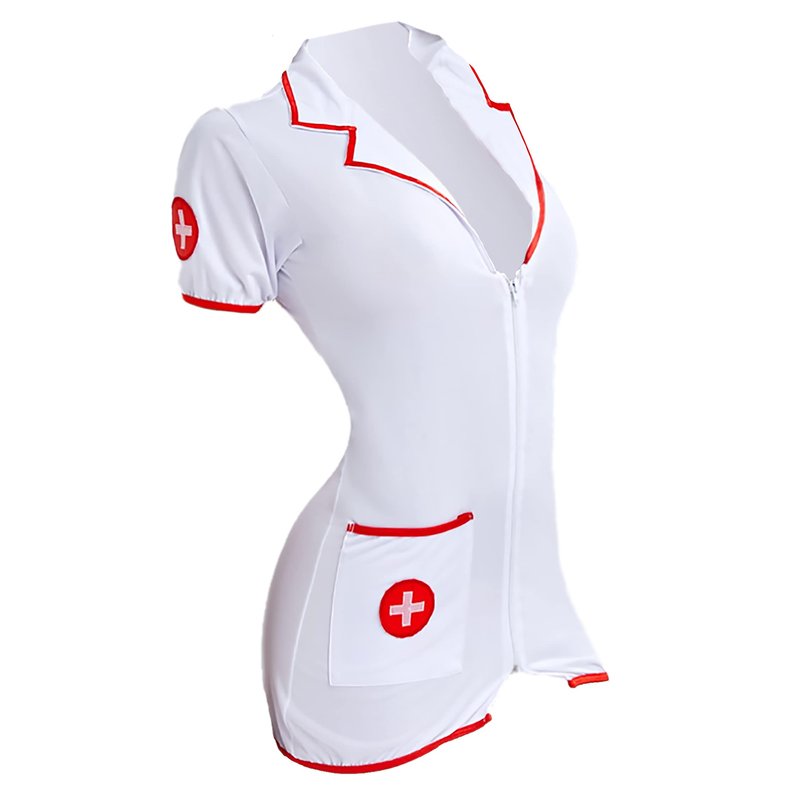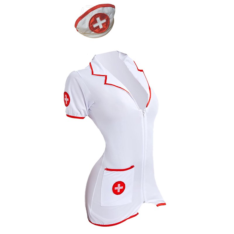 This Nurse Dress-Up Costume is sure to be a hit at the next halloween party! This costume set includes a cute one-piece zippered costume with red trim and head piece. The material is slightly sheer and has a little bit of stretch. Unlike traditional costumes this one is made from 100% polyester and is very lightweight and quite breathable.