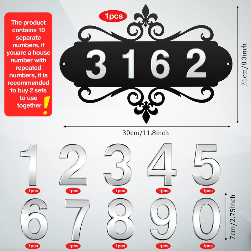 - Nice combination: you will get 1 piece 30 cm/ 11.8 inch iron doorplate, 10 pieces silver 2.75 inch 3D house door numbers, all the 10 numbers are separate, If the numbers need to be repeated, it is suggested to buy two sets of them together, sufficient for you to DIY these numbers and paste them on the iron, and numbers can also be applied in other places, such as mailboxes