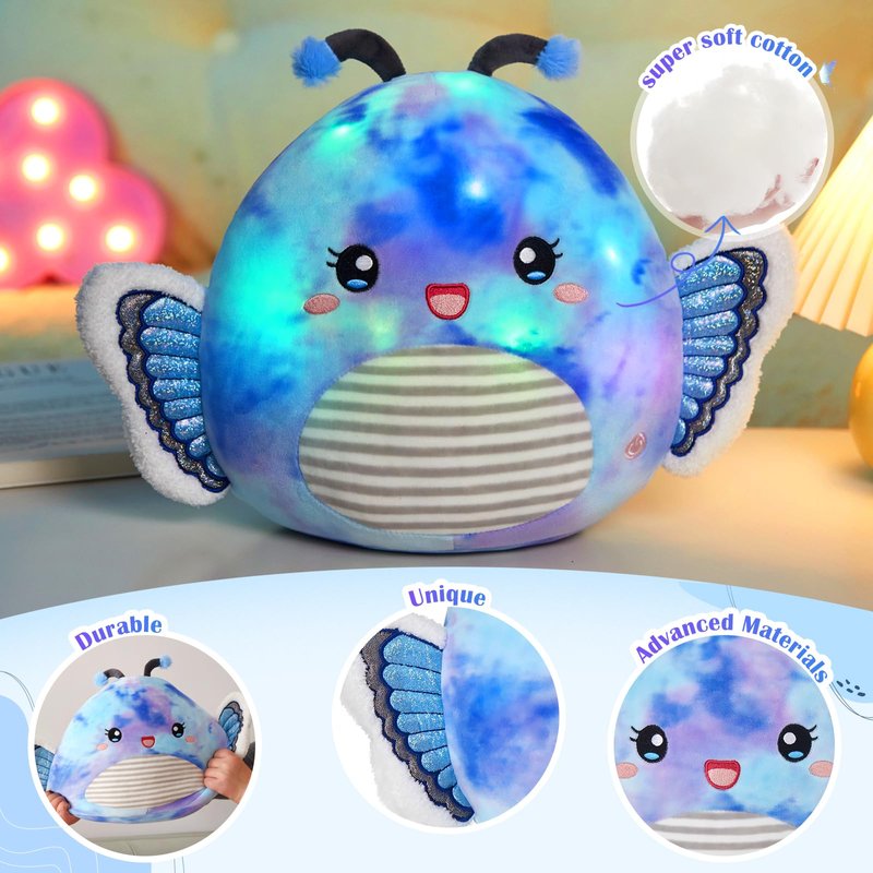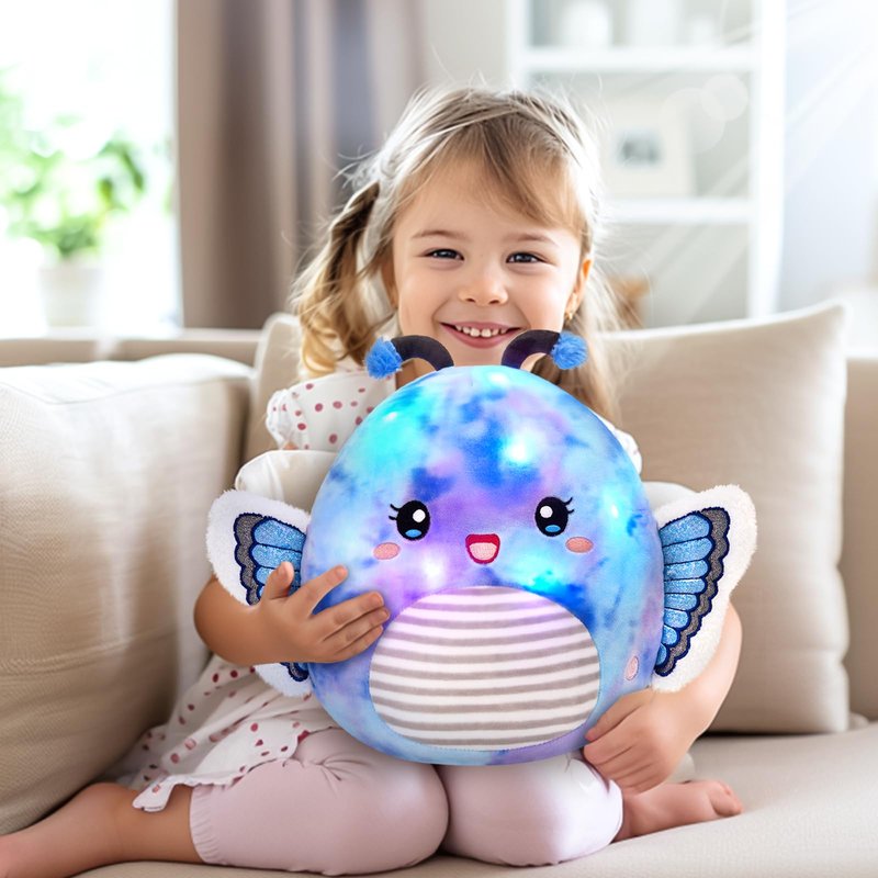 - 【Light up plush pillow】Step into a world of wonder with our Light Up Butterfly Plush Pillow. Adorned in a mesmerizing shade of blue, this butterfly stuffed animal comes to life with the touch of a button, as its embedded LED lights gently illuminate, offering a captivating display that changes with time, enhancing relaxation and tranquility.