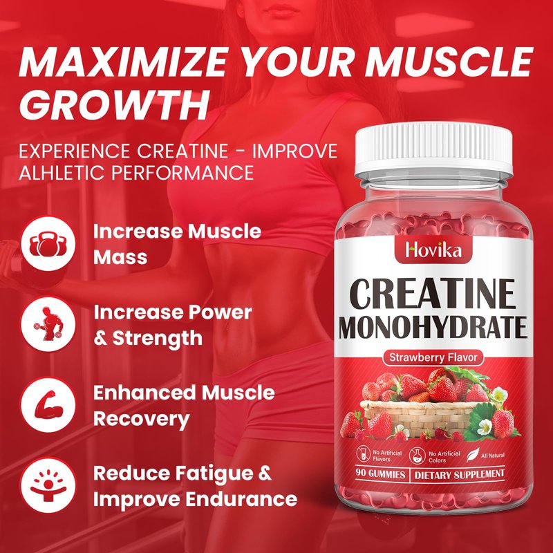 Hovika Creatine Monohydrate Gummies for Men & Women, Chewable 3g Creatine Monohydrate with Vitamin B12 for Muscle Growth & Recovery-Vegan, Natural Strawberry Flavor, 90 Gummies