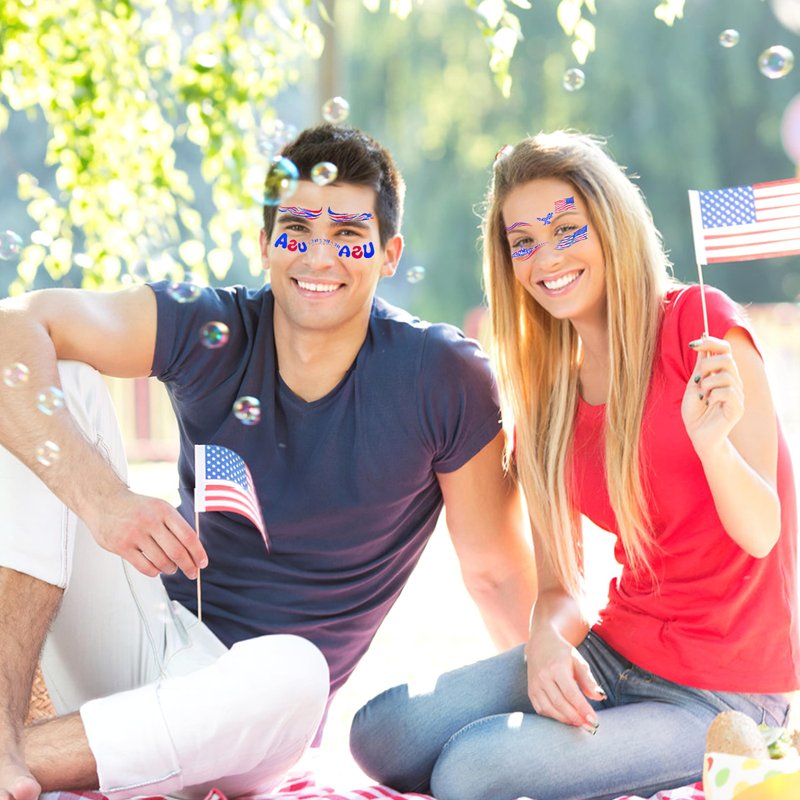 - Bring Endless Funny on July 4th Independence Day Events: Celebrate USA DAY in style! Apply this cute Fourth of July face art tattoos on your chest, face, shoulder, waist, sleeve, back, leg, arm, chest, hand, feet, neck and any other part of your body to show your love and pride to USA, and increase the patriotic atmosphere, You'll be the center of attention in the Independence Day parade crowd, Sending you warm wishes on this special day for our country!