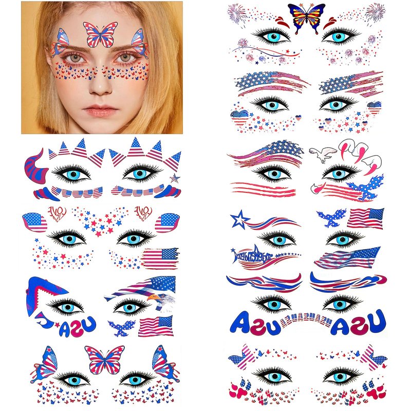 - Festive 4th of July Face Tattoos Sheet: Happy 4th of July! Have a wonderful and patriotic America Day! May your USA Independence Day be filled with joy and festivities by applying these red white and blue face art tattoos to have a USA patriotic look! You will receive 10 sheets Fourth of July face eye tattoos in different designs! USA flag star and stripe and Independence day 4th of July face tattoos are very suitable for sharing with friends!