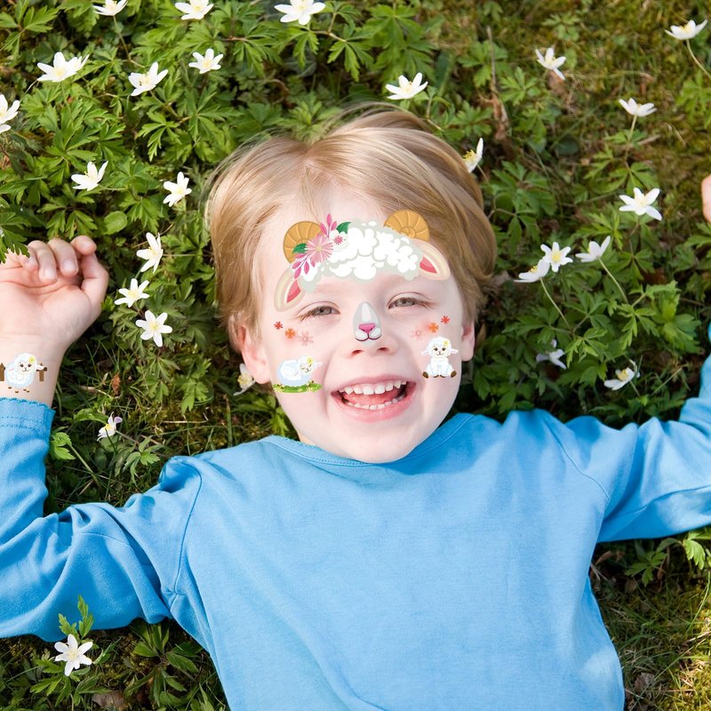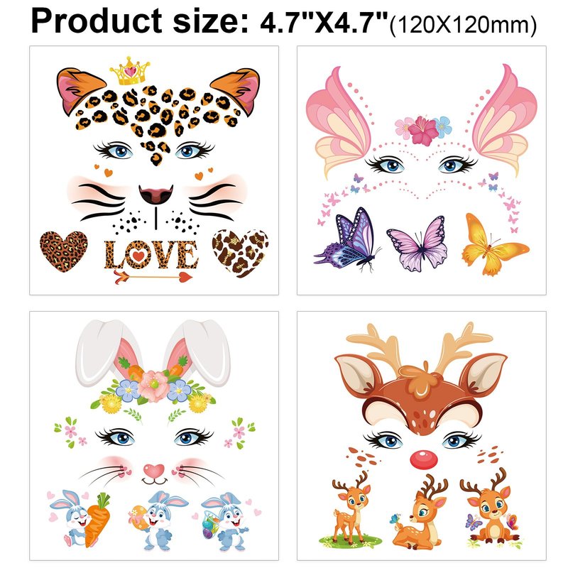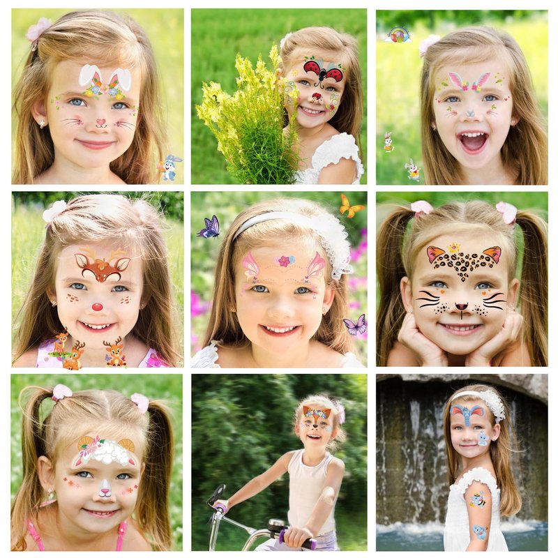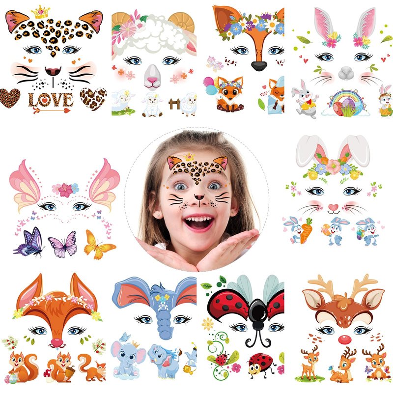 - 10 Sheets Kids Body Paint Makeup Decoration Tattoos Set: 10 styles cute animals themed face temporary tattoos for kids party favors makeup decoration! Include Bunny face tattoos, butterfly face tattoos, sheep face tattoos, Squirrel face tattoos, fox face tattoos, elephant face tattoos, ladybird face tattoos, leopard face tattoos, reindeer face tattoos, kids will have a cute look and fun on Easter party, spring themed party, Halloween party, birthday party, forest baby shower and jungle animal themed party!