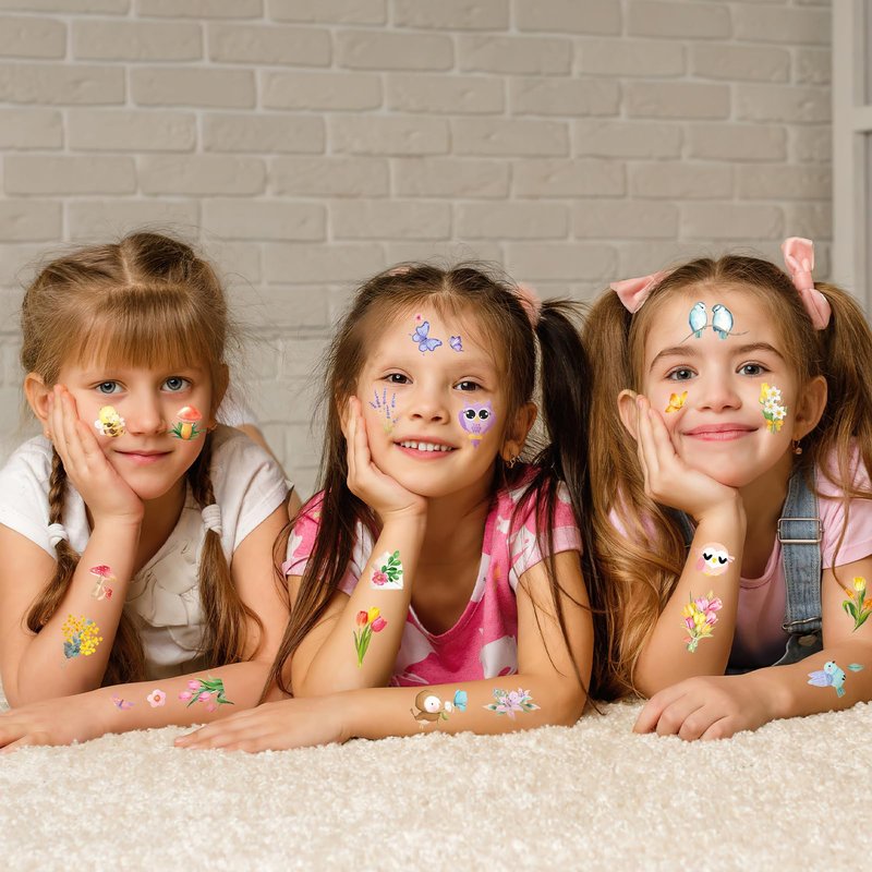 - Safe and Long Lasting: Spring tattoos for kids are made of quality AB glue material, odorless, water-proof and scratch-resistant, safe and non-toxic, have been put through rigorous party decorations testing. Does not harm the skin, both adults and children can use, can maintain for a long time about 3 - 5 days!
