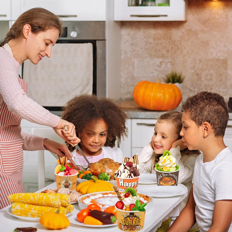 - Paper Material: Our Friendsgiving Party treat cups are made with BPA-Free food grade strengthened paper making them a great fit for ice cream, frozen yogurt, parfaits, snacks, and more! Hot or cold, our cups will take care of your frozen treats or hot soup, chili, and more. interior of the paper ice cream cups for Thanksgiving party supplies are features a leak-resistant coating to prevent unwanted mess and spillage!