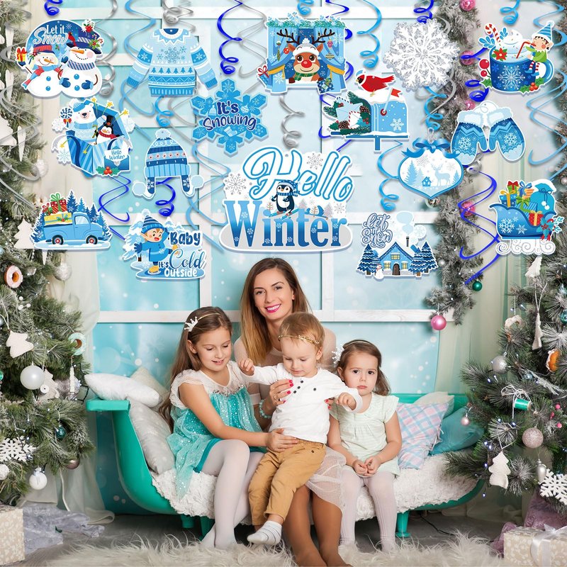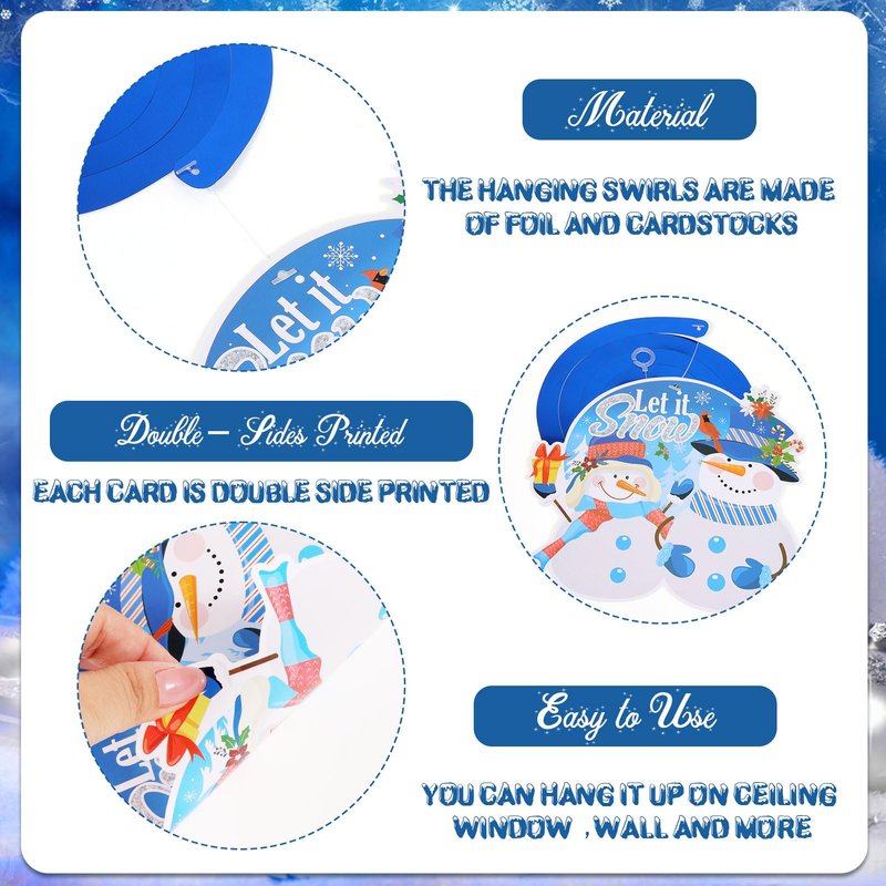 - Easy to Assemble: It's Snowing Party Decorations Snowflake Swirls are pre-assemble, Hello Winter Hanging Decor have a transparent hooks on top, suitable for being hung from ceiling, branches, fireplace, tables, window, doors. Each swirl can be extended to approx 30 - 40 inches in length, vibrant snowflake patterns and Christmas patterns can surprise your guests and as the eye catching Winter party photo background!