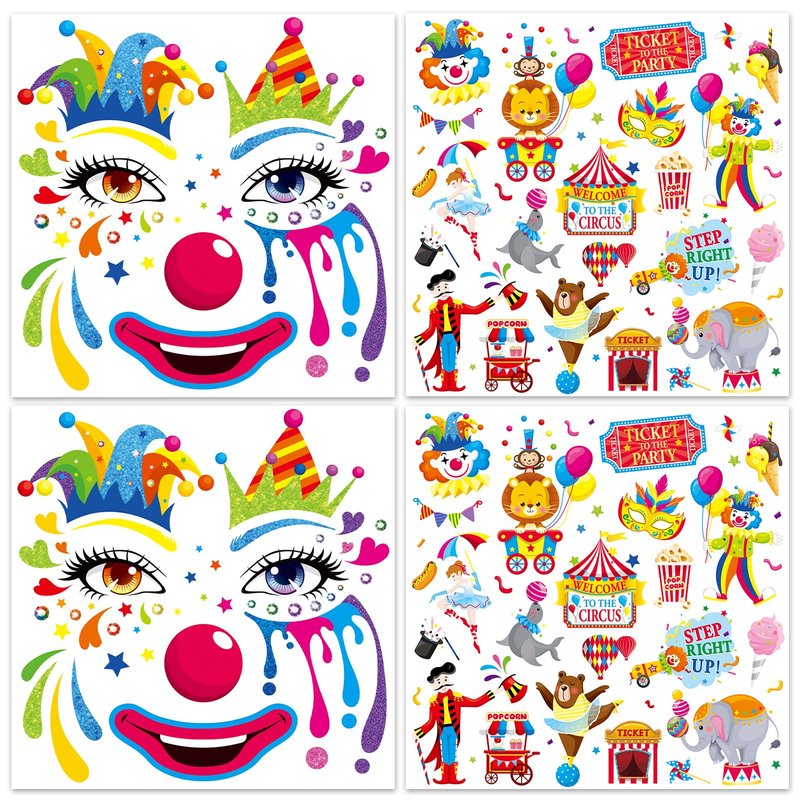 - Carnival Circus FaceClown Face Tattoo: You will get 2 sheets Clown Face Tattoo + 2 sheets Clown Temporary Tattoos for Kids Adults, in 2 different designs. Our Clown Face Stickers are most suitable for festival, Halloween. Tattoos, Circus Clown Full Face Temporary Tattoos