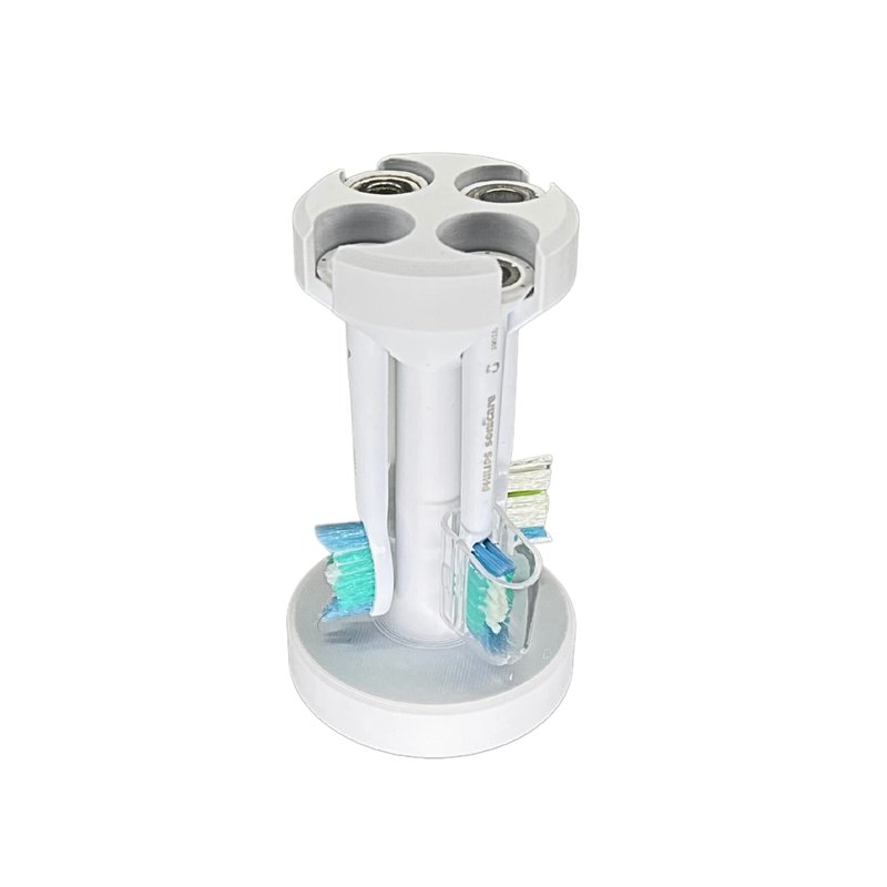 Countertop 3D printed electric toothbrush brush head holder. Compatible with Philips Sonicare brush heads. Holds up to 4 brush heads. Holder has 4 rubber feet and a suction cup to keep it firmly in place on smooth non-porous surfaces.