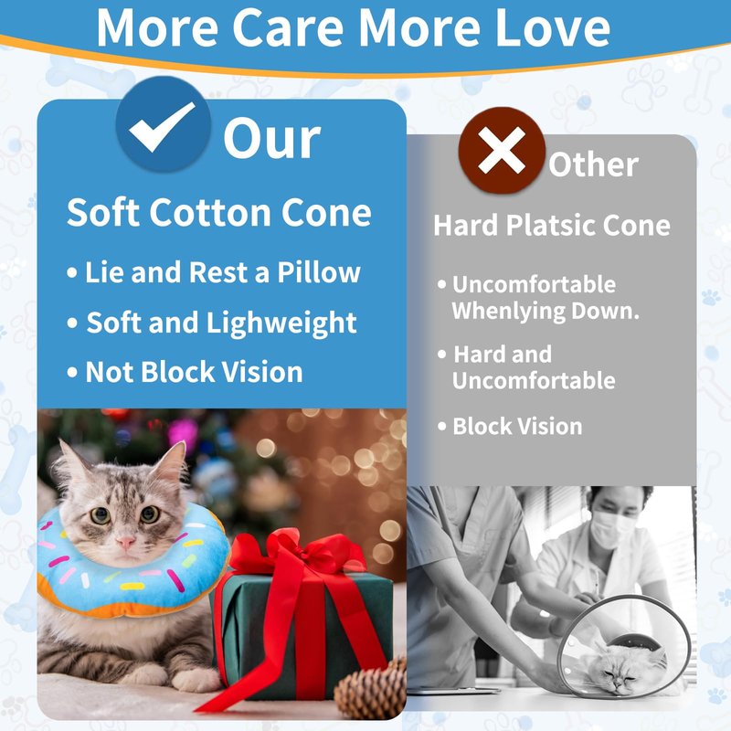 The cat donut collar is made of super soft and lightweight PP cotton, not as stiff as a plastic cone, which is comfortable to wear and makes your pet move freely.