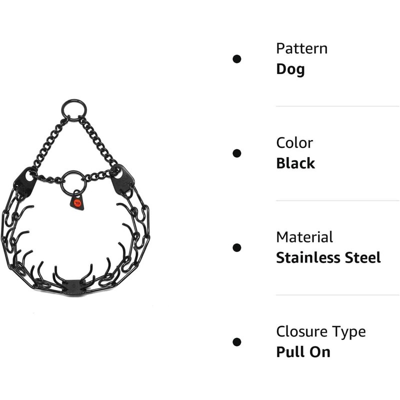 - Black Stainless Steel Prong Collar: This model comes with two O rings: Size Small, 2.25 mm x 16 inches overall collar length; neck size Up To 13 inches