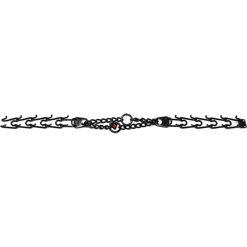 The Herm Sprenger Black Stainless Steel Prong collar is one of the most recognizable and popular names in obedience training tools. A safe and effective alternative to choker collars, it puts even pressure around the neck, about every half inch, pinching the skin in a band. This collar does not apply direct pressure to the trachea, so you can train your dog with little or no tugging, jerking, or pulling. The addition of a center plate connector allows the middle link to be configured symmetrically, enabling the prongs to tighten in the same direction. Made of high quality German Black stainless steel, the size of this collar can be adjusted by adding or removing the links individually. Features: interlocking links, each link equipped with two blunt prongs slips over dog's head for easy on, easy off slightly beveled prong tips easy to increase or decrease in size Made of high quality Black stainless steel Additional links sold separately. Sizing instructions: collar should fit snuggly just below the dog's ears, measure the circumference of dog's neck and add 3 inches. These Black Stainless steel collars with O ring come in three sizes 2.25mm gauge x 16 in overall length, 3.2mm gauge x 23 in overall length and 4mm gauge by 25 in overall length