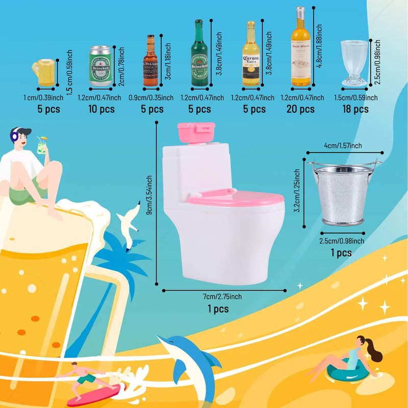 - PACKAGE INCLUDES -- 200 g of 0.1 inch/ 3 mm miniature dollhouse ice cubes, 50 mini Beer Red Wine drinks,17 mini diy tableware,1 miniature Ice bucket,1 miniature Ice clip,1mini Toilet.The quantity is enough to meet the needs of the family. Besides, cute size makes them act as dolls in the miniature cup at home
