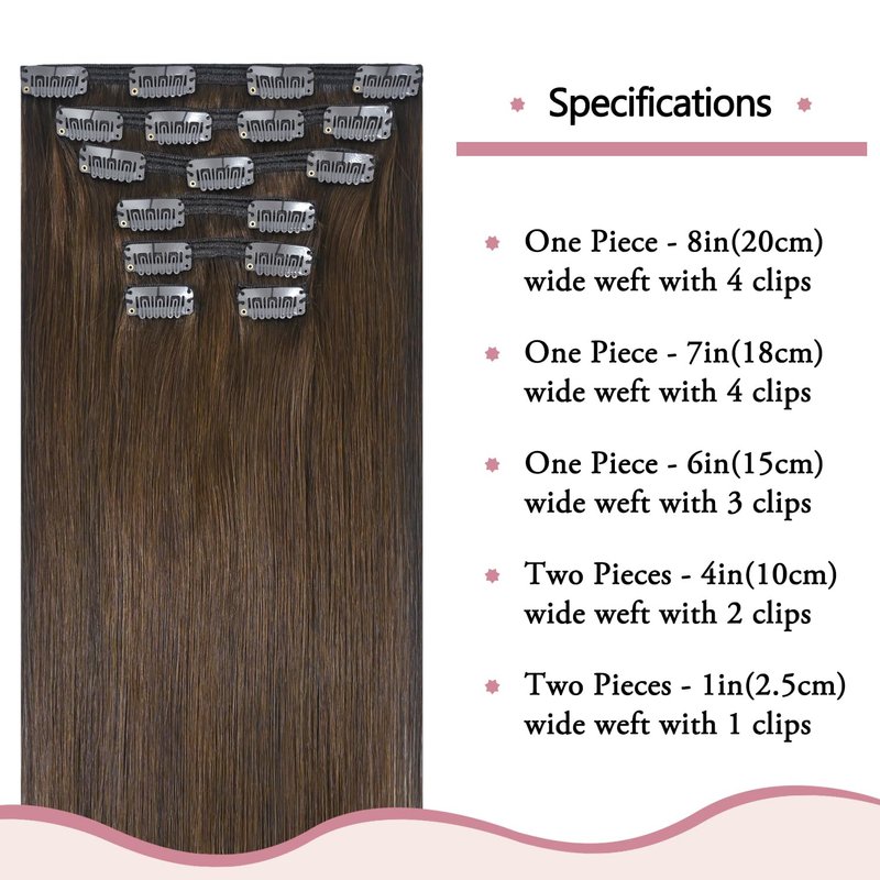 - Brown Hair Extensions Specification: real hair clips extensions for women, Its color is chocolate brown(medium brown), 7 pieces 120g with 16 clips per set.Just to thicken your hair, we suggest 1 sets; for a full head, we suggest 1-2 sets