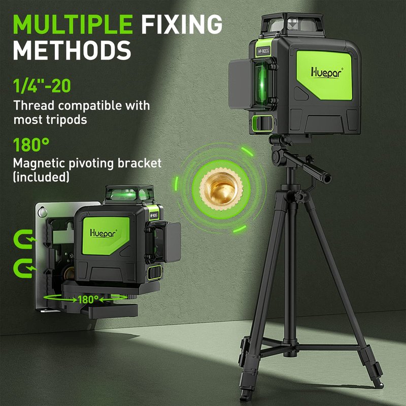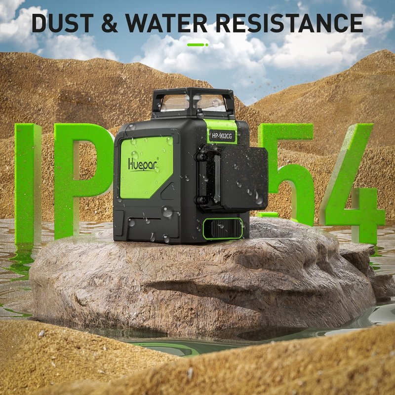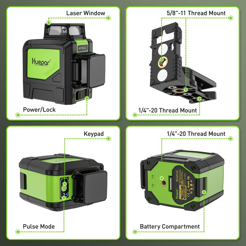 - ⭐WARRANTY & KITS INCLUDE- Customer can enjoy 12 months limited warranty but up to 24 months longer warranty if you become a royal customer through the product registration (Offered on the package box). Huepar 902CG Self-Leveling Laser, Easy-to-Adjust magnetic base, Target plate card, Carry pouch, AA batteries, Instruction Manual.