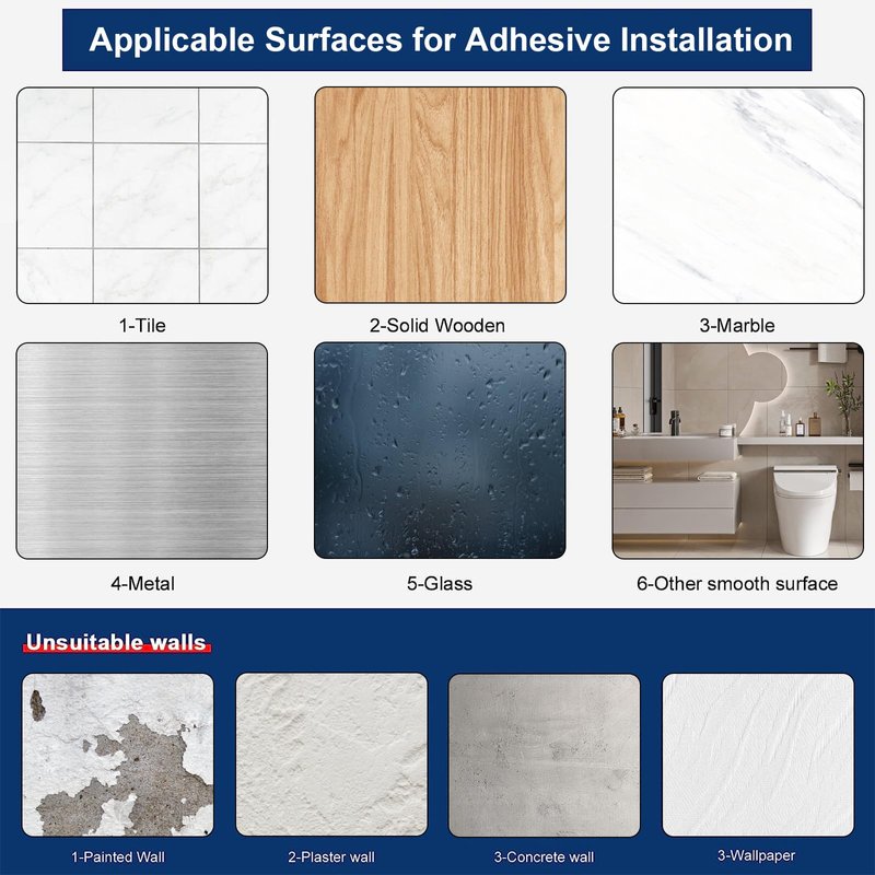 - APPLICABLE SURFACES: Must be smooth surface such as wooden ,ceramic tiles, marble stone, metal, glass etc. Make sure to clean the wall surfaces before installation. (Not suitable for limestone wall, wall paper or painted wall or uneven surfaces.)