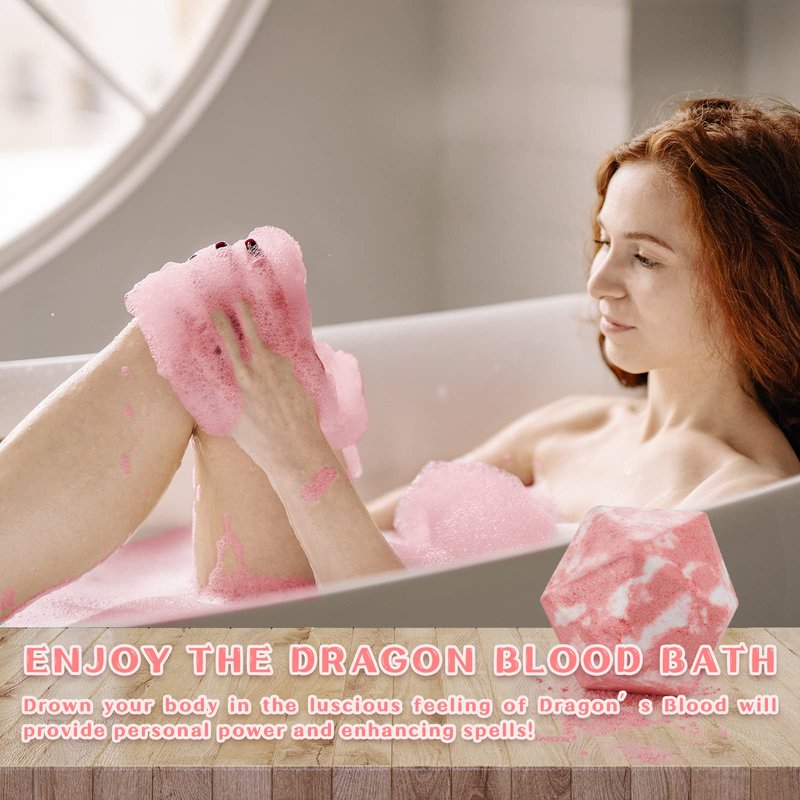 - ENJOY THE DRAGON BLOOD BATH - The Dragon Blood Bath Bomb smells a fresh peach & rose fragrance and will turn your water a light red, giving the illusion of a blood bath, but won't dye your skin or your tub. Drown your body in the luscious feeling of Dragon's Blood will provide personal power and enhancing spells!