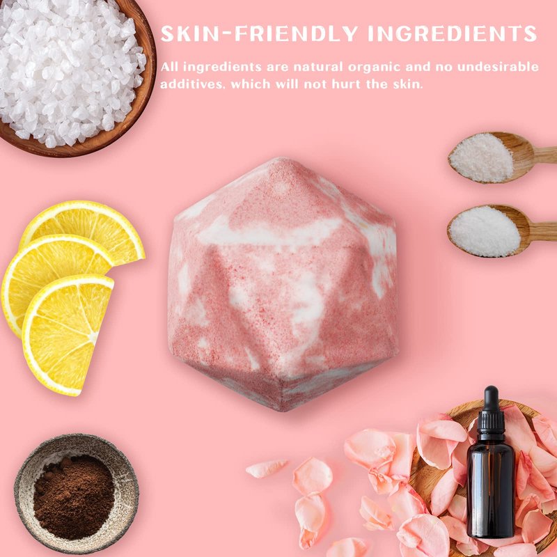 - SKIN-FRIENDLY INGREDIENTS - These D&D dice bath bombs contains of baking soda, citric acid, epsom salt, corn starch, natural & artificial colours, mica and fragrance oils. To nourish the skin while keeping the best fizz effect. All ingredients are natural organic and no undesirable additives, which will not hurt the skin.