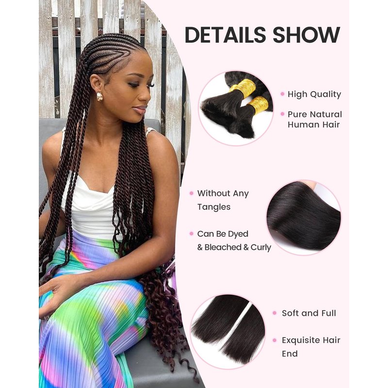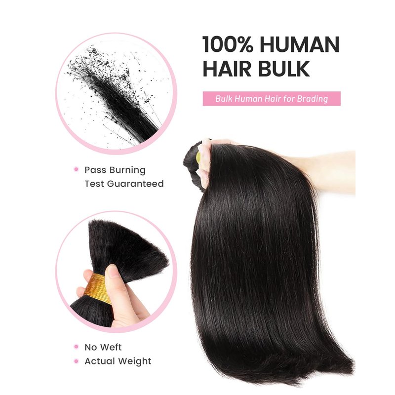 • Virgin Hair: bulk human hair for braiding are sourced from the finest Brazilian virgin hair, untouched by chemicals. Enjoy hair that feels naturally soft, elastic, and boasts a dense, full-bodied texture.