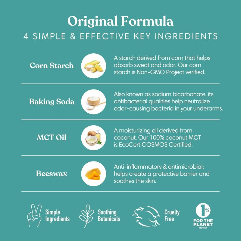 - ALUMINUM-FREE DEODORANT: Just 4 simple ingredients, plus essential oils and botanical extracts to create a variety of scents. Humble Brands Aluminum-free Original Formula Deodorant is made with non-GMO corn starch, beeswax, baking soda, and MCT oil.