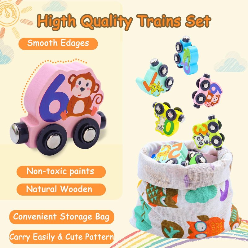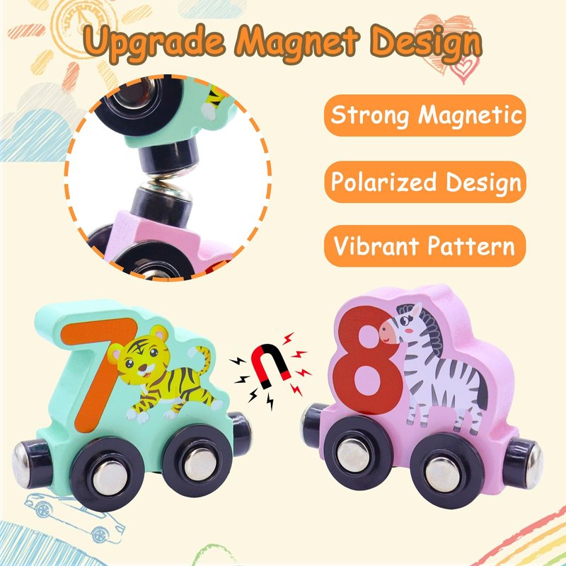 - SECURE MAGNETIC CONNECTORS: Smooth-rolling wheels ensure lasting quality. Strong magnets allow the train cars to connect securely, and their polarized design helps kids learn numbers in order by guiding them to attach the cars in the correct direction. Perfect preschool activity to learn through play