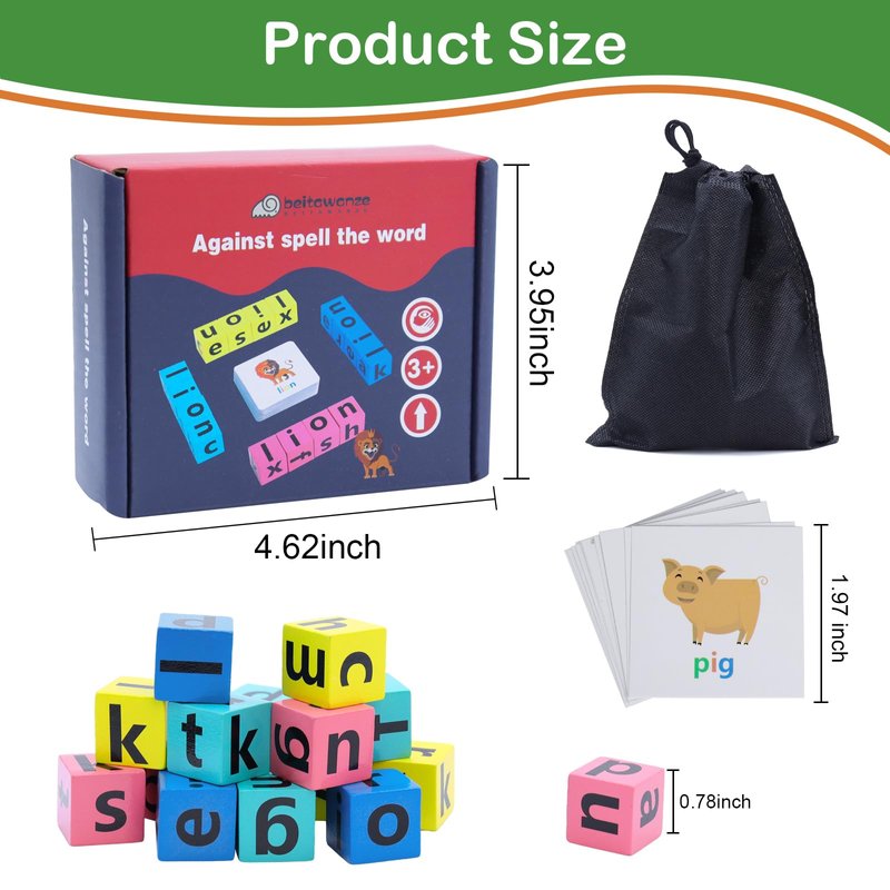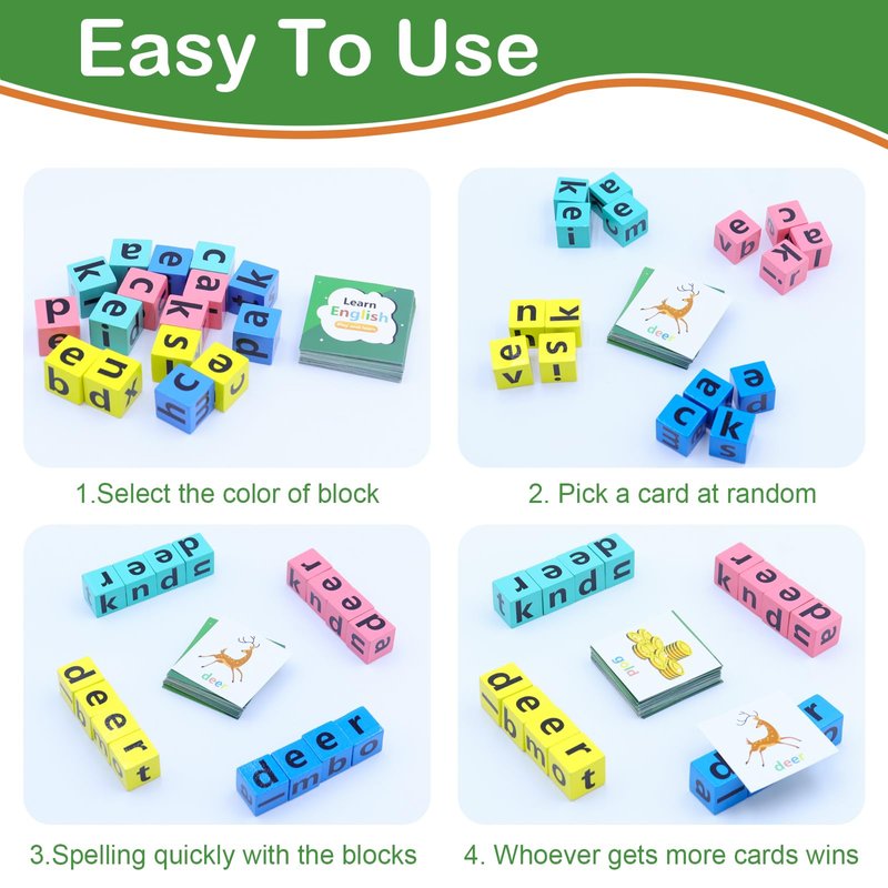 - 【FUN TO PLAY】: Our word race cube game is suitable for 1+ players and for ages 3+. Here 4 different colors wooden letter blocks, Everyone match the color blocks, than pick a flashcard at random. who can spell the correct word with blocks quickly. Whoever gets more cards wins in the end. You also can play the letter games match your own spelling game and activities via imagination. Build kid's confidence and improve vocabulary while play