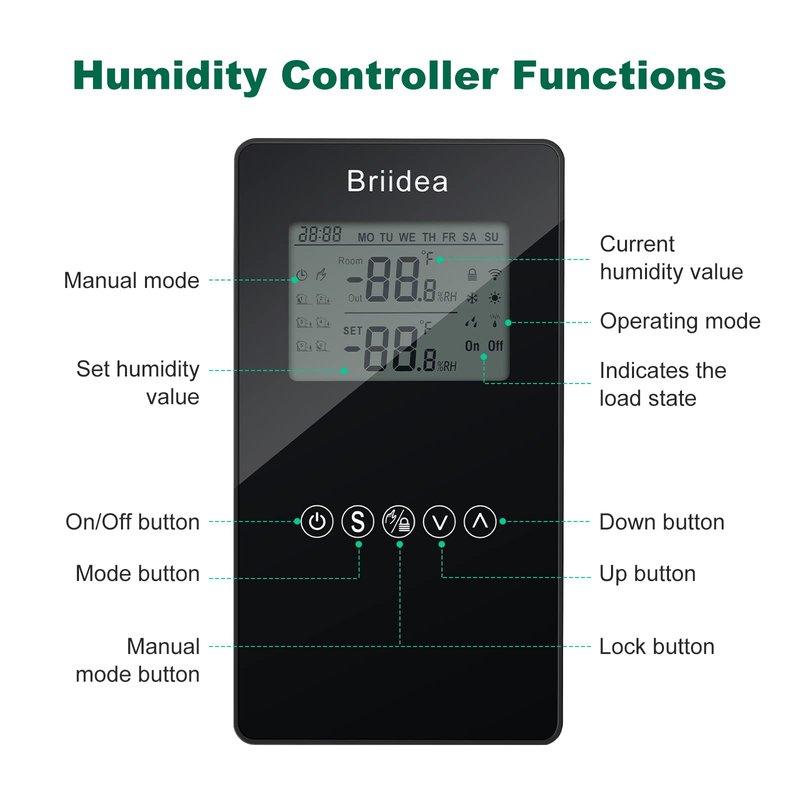- MULTIFUNCTION: The humidity controller has a series of practical functions, including dehumidification and humidification mode, manual and automatic mode, high or low humidity alarms etc. Turn on/off your equipment automatically to reach the ideal humidity level. Humanized intelligent operation design is realized